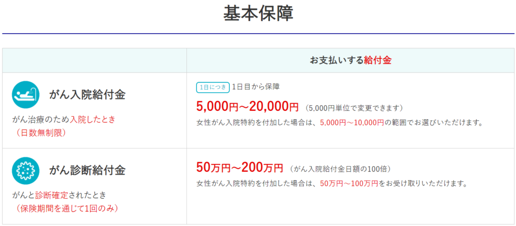 がんと診断確定されたとき、50万円から200万円の一時金を受け取れます。保障額は、がん入院給付金日額の100倍です。上皮内がんも同額の保障です。