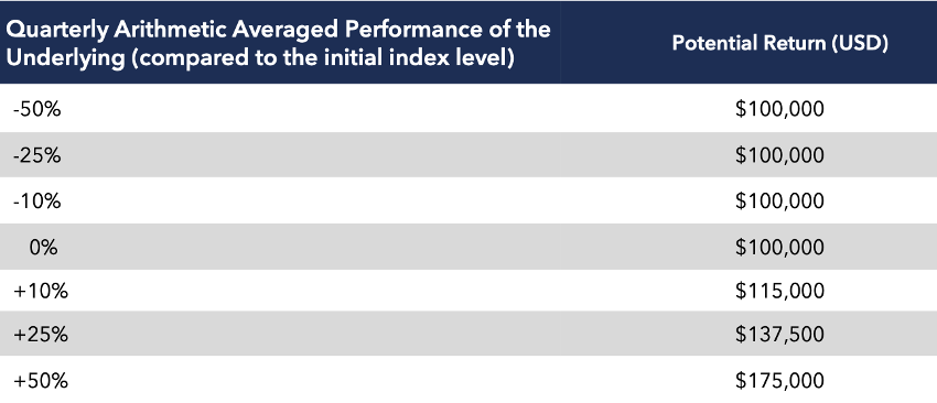 満期まで合計24回の平均日(四半期ごとの算術平均)がありますが、満期時にこの平均リターンに対して参加率を乗ずることになります。