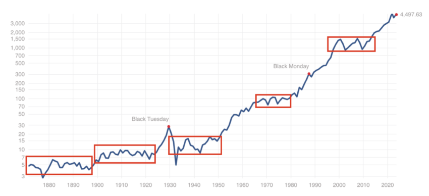 S&P500インデックスは、過去に何度も株価が大きく下がる局面がありましたが、