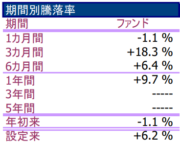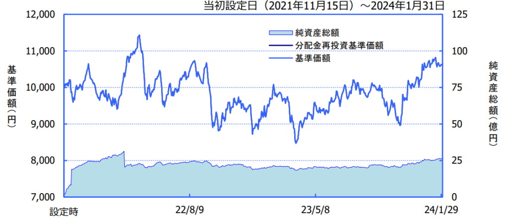 このファンドは毎月分配型、資産成長型(為替ヘッジあり/なし)がありますが、今回は資産成長型(為替ヘッジなし)の騰落率で解説します。ファンド設定は2021年11月15日なので2年強の実績となりますが、直近1年で+9.7%、設定来で+6.2%の騰落率になります。