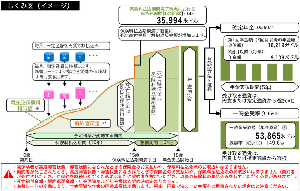また運用通貨は米ドルか豪ドルですが、保険料は円建で固定されているので、毎月積み立てる外貨は変動します。なので満期時の外貨建金額は確定しておらず、為替の影響もあるので円建の受取金額も変動します。