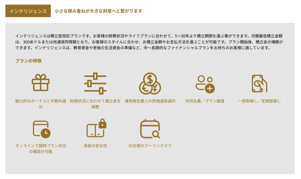 異なる部分はいろいろありますが、私は、他の海外積立投資商品よりもこの「インテリジェンス」をクライアントへ紹介したいとは思わないですね。