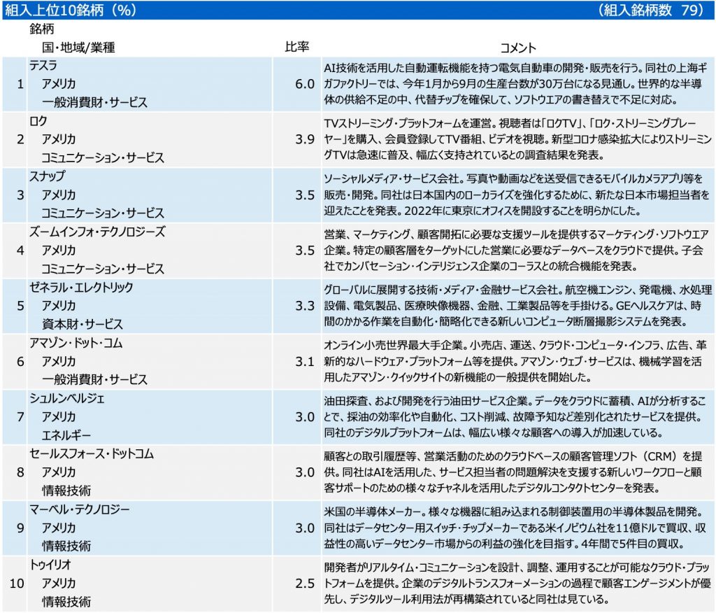 最新のマンスリーレポート(2021年09月30日)で確認すると、組入銘柄数は79、組入上位10銘柄は以下となっております。