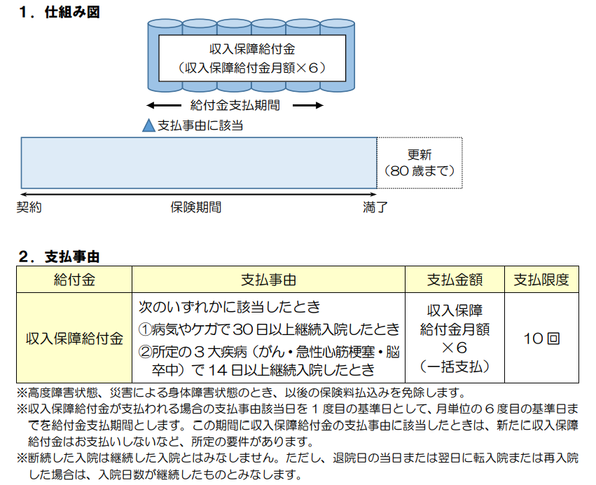 ①病気やケガで30日以上継続入院したとき、もしくは②所定の3大疾病(がん・急性心筋梗塞・脳卒中)で14日以上継続入院したときに「収入保障給付金月額×6」を一括払いで受け取れます。収入保障給付金月額は5~50万円の範囲で設定可能です。したがって、支払事由に該当したときの最低保障:30万円・最大保障:300万円です。