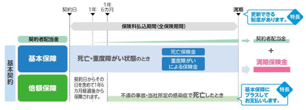 死亡や高度障害になったときに保険金額が受け取れます。契約日から1年6ヶ月経過後に災害で死亡したときは1.2倍の保険金額を受け取れます。何事もなく満期を迎えると満期保険金(基本保障の20%)を受け取って契約は終了です。