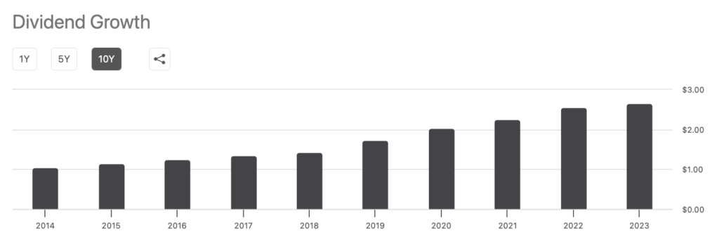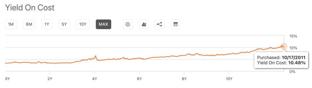 また、こちらの銘柄のように、毎年、分配金の利回りが増えていき、もし2011年10月に投資していれば、現在、その分配金利回りは10.48%になっているような銘柄もあります。