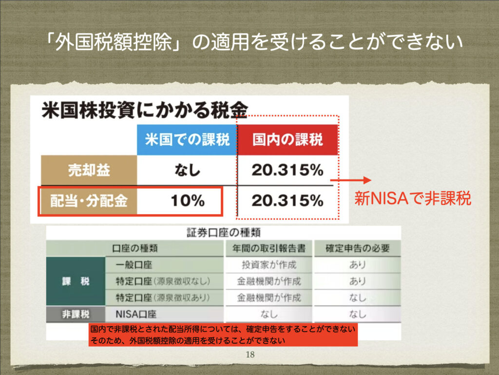 また、これもセミナーで解説しましたが、米国株投資にかかる税金(10%)は新NISAでは非課税にできませんので、「国内株高配当型投信」などで運用するのが適しているかも知れませんね。