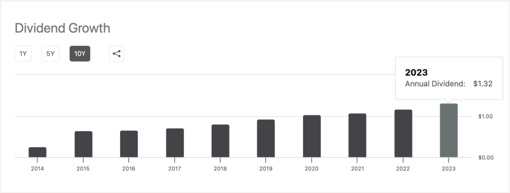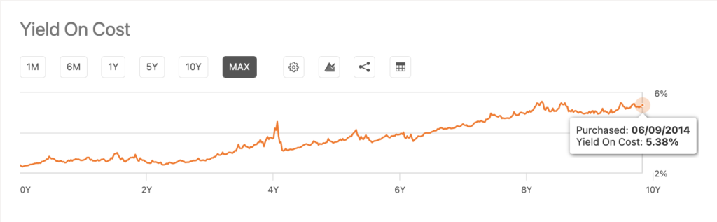 そして、もし「DGRO」におよそ10年前の2014年6月9日に投資していれば、現在の分配金利回りは5.38%まで上昇しております。