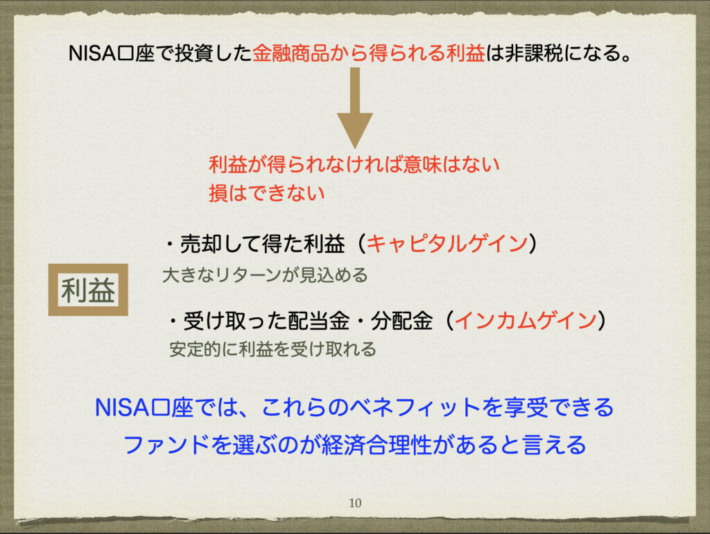 先般もセミナーで、新NISAでは「大きなリターンが見込めるファンド」や「安定的に利益を受け取れるファンド」を選ぶのが経済合理性があると解説しましたが、配当金や分配金を受け取れるファンドも適しておりますね。