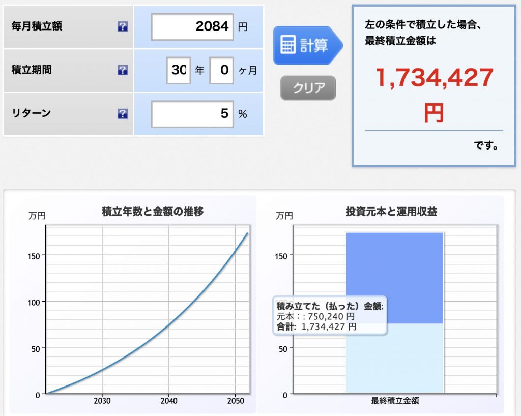 仮に2,084円を30年間積立投資して年利5%で運用すると、
