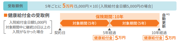 対象期間中に10日以上継続の入院がなかったとき、給付金を受け取れます。5年ごとに、入院給付金日額10倍の額が給付されます。