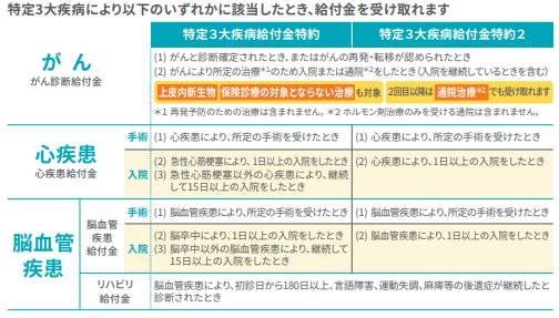 特定3大疾病で以下の状態に該当したとき、給付金を請求できます。特約と特約2があり、支払限度は年に1回、回数無制限です。