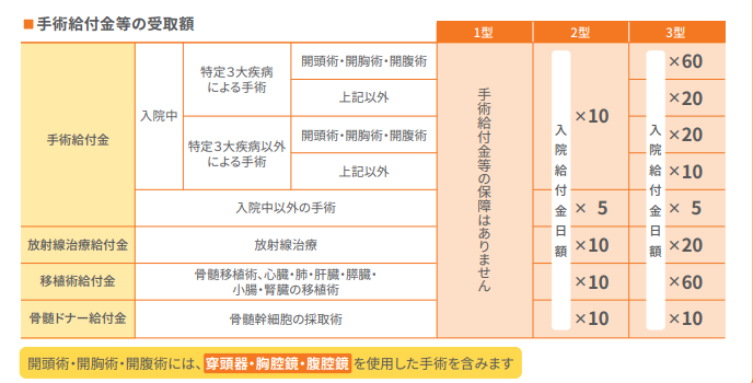 病気やケガで所定の手術を受けたとき、給付金を請求できます。給付金額は1型(保障なし)・2型・3型の3タイプから選択。支払限度は無制限です。