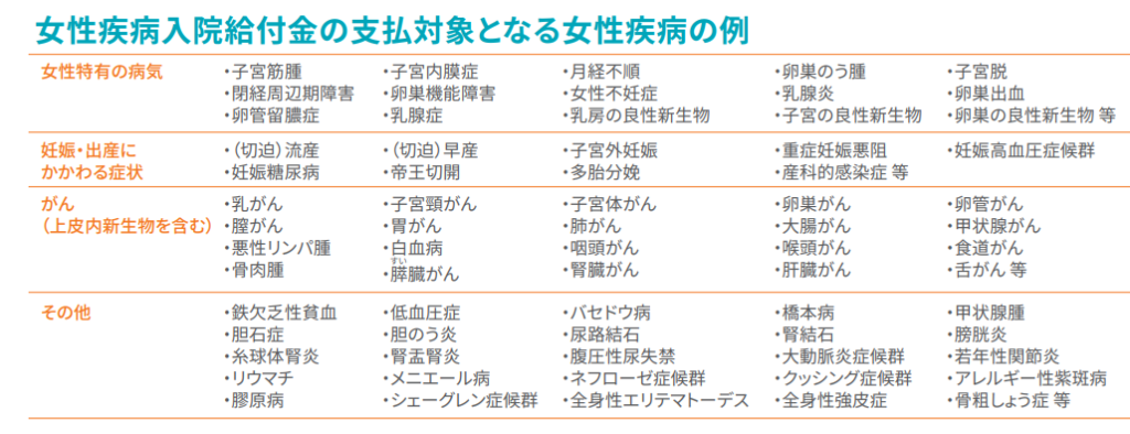 所定の女性疾病で入院したとき、日帰り入院から給付金を請求できます。通算1,095日が限度ですが、がん入院は無制限です。また、所定の女性疾病で手術を受けたとき、給付金を請求できます。乳房再建術を受けたとき、およびがん治療で脱毛の症状が生じたと診断された場合も、給付金の支払対象です。