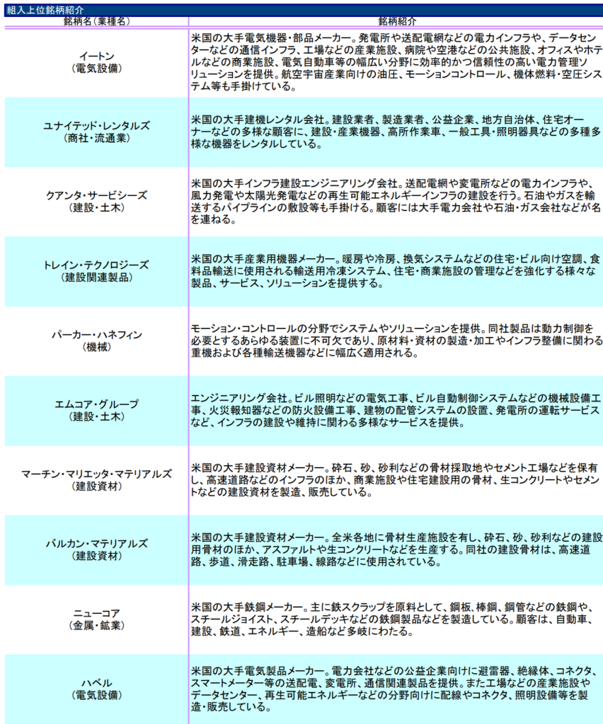インフラ構築に関連しそうな業種がまんべんなく含まれています。先ほど触れていただいた通り個人投資家が知っているような銘柄は含まれませんね。
