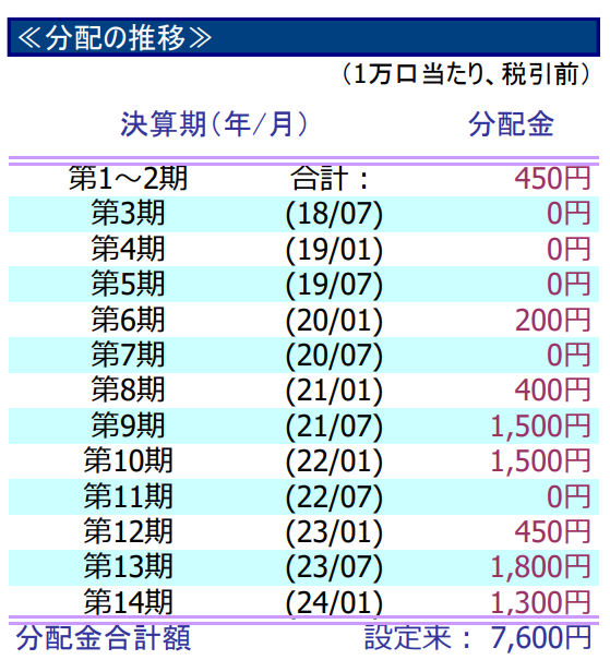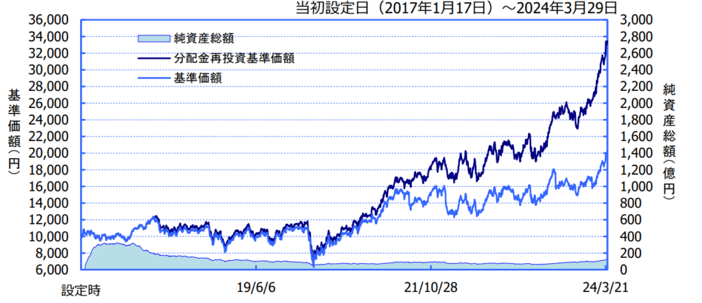 こちらのファンドは為替ヘッジあり、なしがありますが今回は為替ヘッジなしの数値で解説します。直近1年で+63.5%、3年で+110.2%の騰落率になります。分配金は安定しませんが出る決算期もあります。