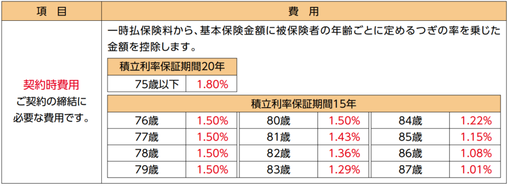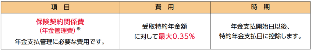 「年金支払移行特約」および「死亡給付金等の年金払特約」を付加した場合、年金受取期間中の毎年の特約年金支払日に、つぎの費用を負担していただきます。
