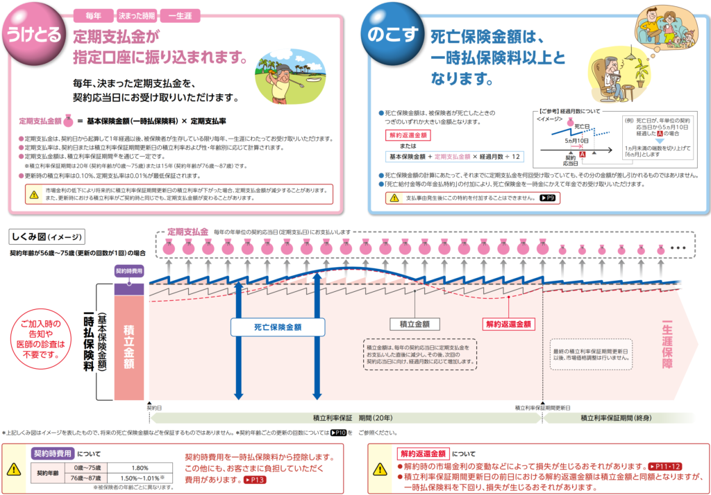 一時払の終身保険です。契約時の積立利率によって毎年の受取金額が決まります。積立利率は毎月2回(1日と16日に)更新され、契約時の積立利率が年齢に応じて20年または15年間固定されます。その後は20年または15年毎に更改されます。告知が必要ないので誰でも申し込みでき、死亡保険金額は一時払で入金した金額が最低保証されています。