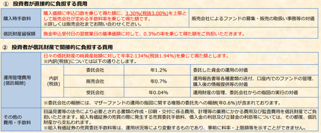 購入時手数料は3.3%、毎年の管理費用は2.134%、解約時0.3%、その他手数料もかかります。