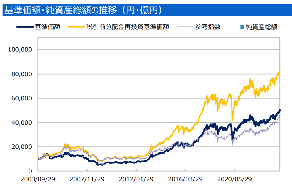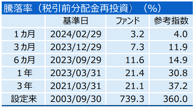 直近1年で+21.4%、3年で+21.1%の騰落率になり、分配金も安定的に出ます。参考指数はラッセル野村小型インデックス(配当込み)です。