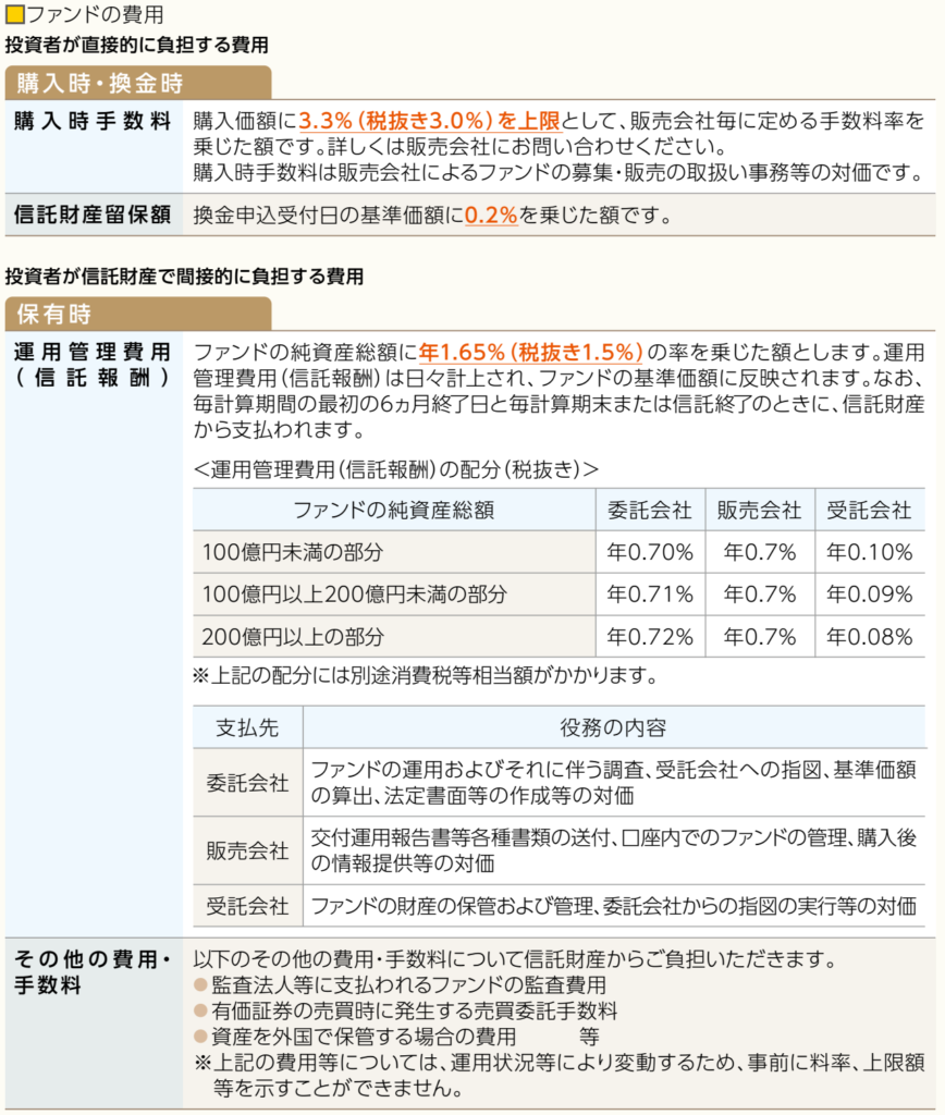 購入時手数料は3.3%、毎年の管理費用は年率1.65%、解約時手数料0.2%、その他手数料もかかります。