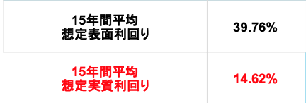 さて、気になるリターンを15年間/概算損益計算/PLという資料で説明いただきましたが、そこに記載されている15年間平均想定実質利回りは14.62% でした。