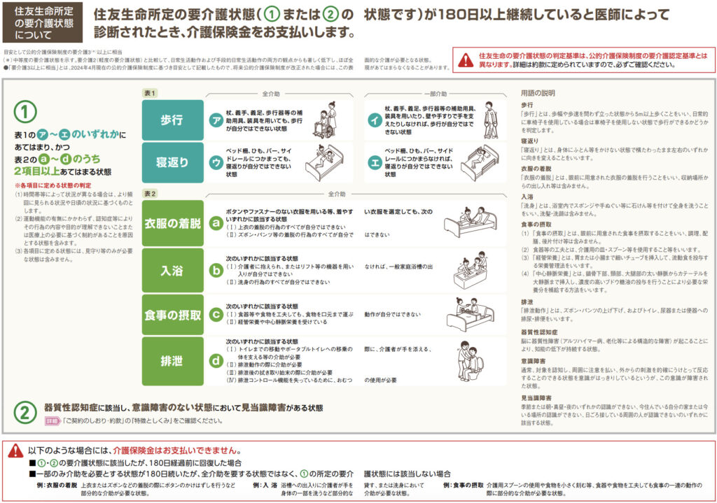 傷害または疾病により、住友生命所定の要介護状態になられ、その状態が継続して180日あると診断されたときに介護保険金を受け取ることができます。
