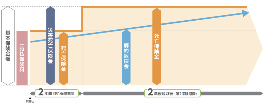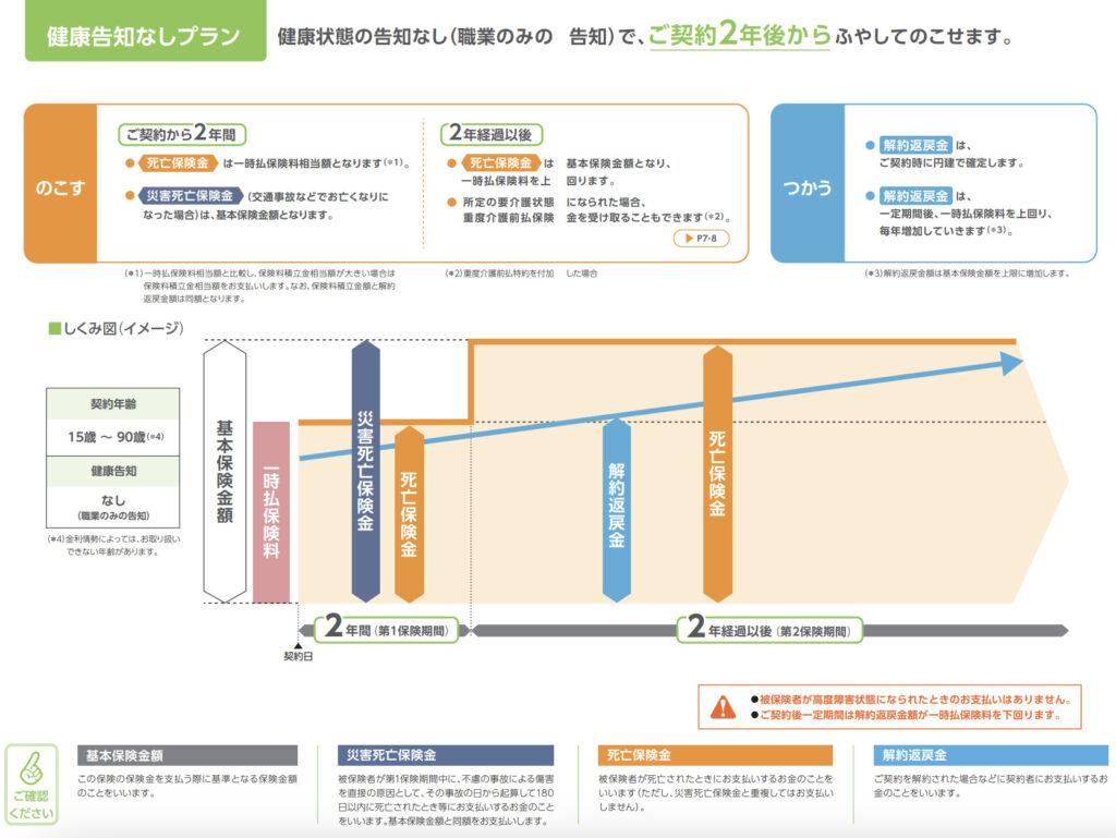 - 告知なしは契約から2年間は死亡保障の上乗せがなく、2年後に死亡保障が立ち上がります。災害死亡の場合は2年以内でも2年後の死亡保険金が支払われます。