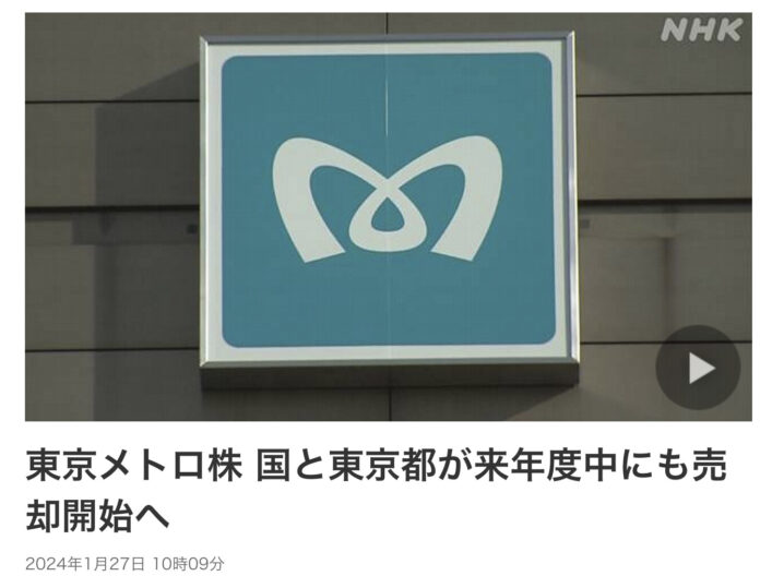 - 国、東京都の保有するメトロ株の50%を売却することが決定