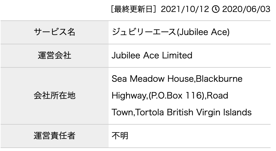 まずは、ジュビリーエースの会社HP等調べてもそれ相当のものが出てきません。
