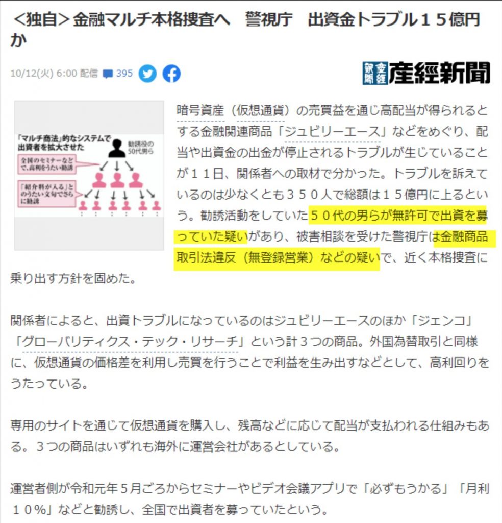 昨年秋頃から出金停止となり、警視庁がジュビリーエースを含む関連商材に対して、本格的な捜査を開始するようになりました。
