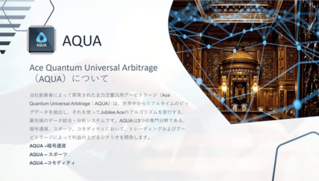 正式名称は主力定量汎用アービトラージ(AceQuantum Universal Arbitrage:AQUA)であり、世界中からビッグデータを抽出してジュビリーエースのアルゴリズムを実行するデータ統合、分析システムになります。
