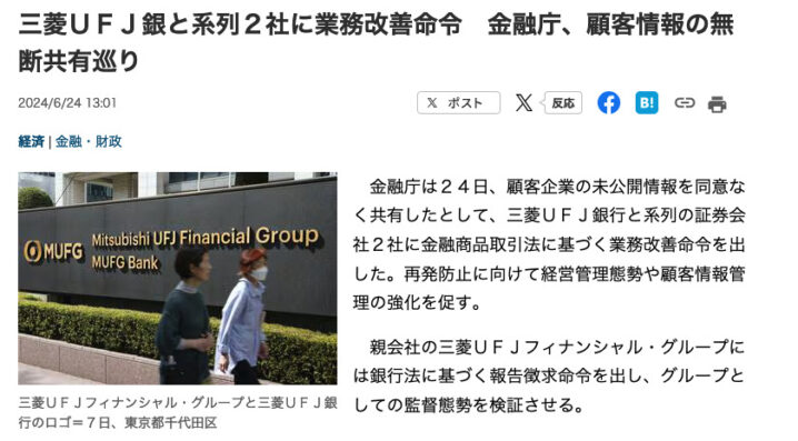 はい、三菱UFJ銀行等3社に業務改善命令が出されました。