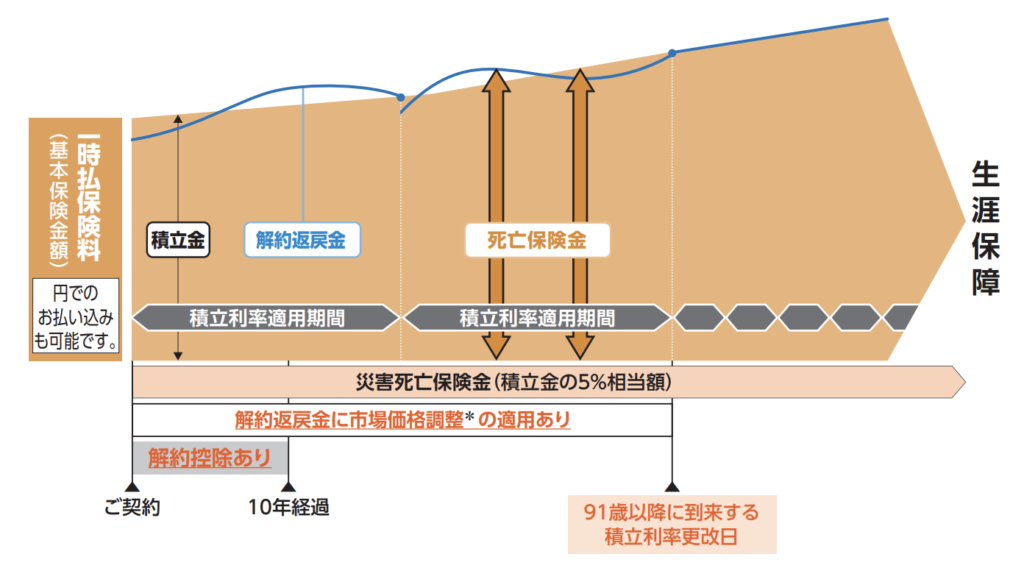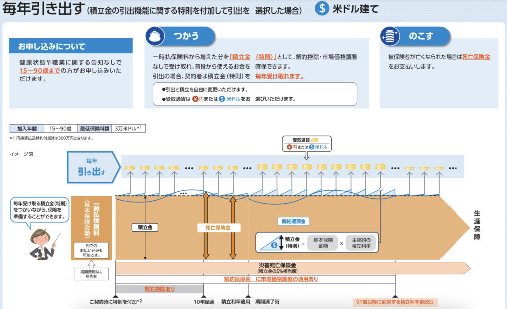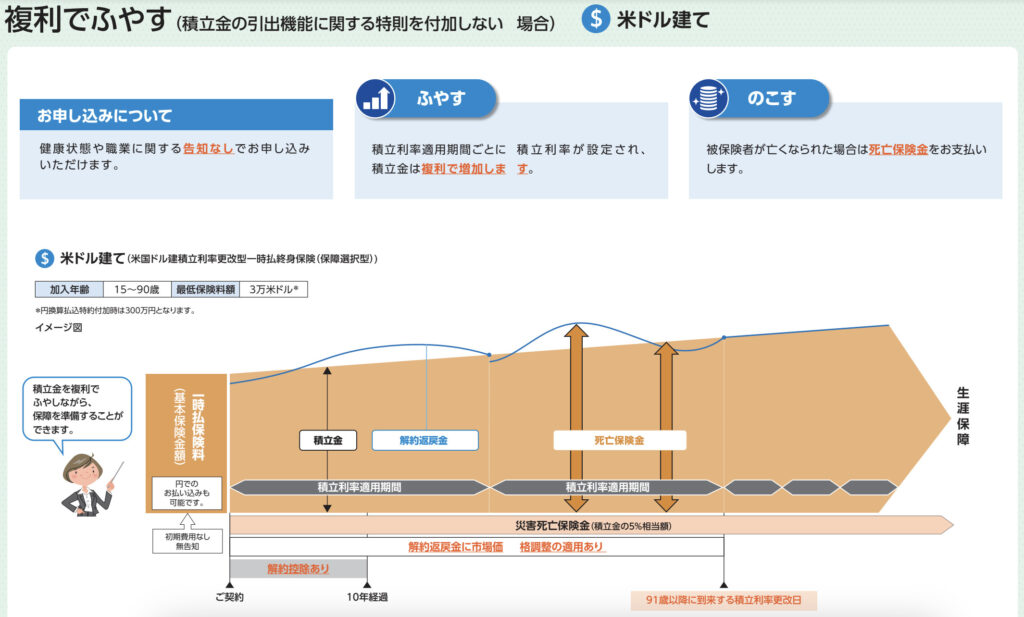 正式名称:米国ドル建積立利率更改型一時払終身保険(保障選択型)(無配当)