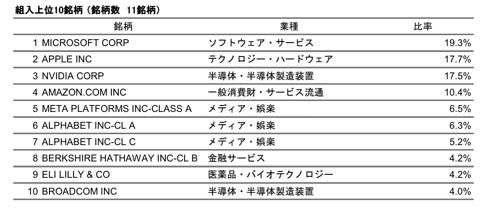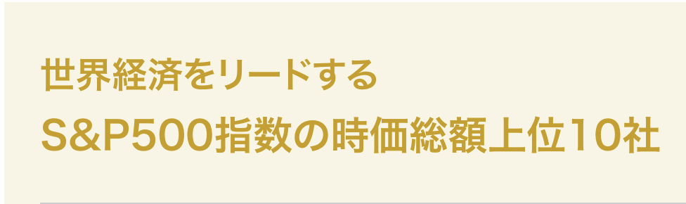 - S&P500指数の構成銘柄のうち、時価総額上位10社の株式に投資する