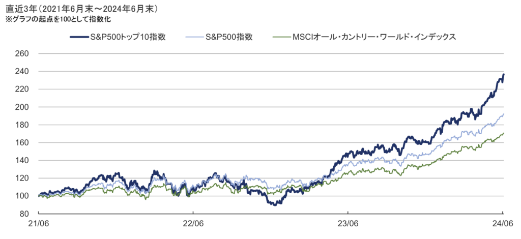 最新のマンスリーレポートで直近3年のS&P500トップ10指数と主な株価指数の推移を見てみると、大きな乖離が生じていることが分かります。