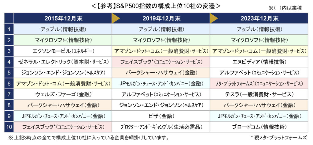 S&P500トップ10指数を構成する銘柄数は、限定的ながら、特定のテーマやセクターに縛られることなく、市場を牽引するトップ企業や勢いのあるセクターによって毎年再構築されます。