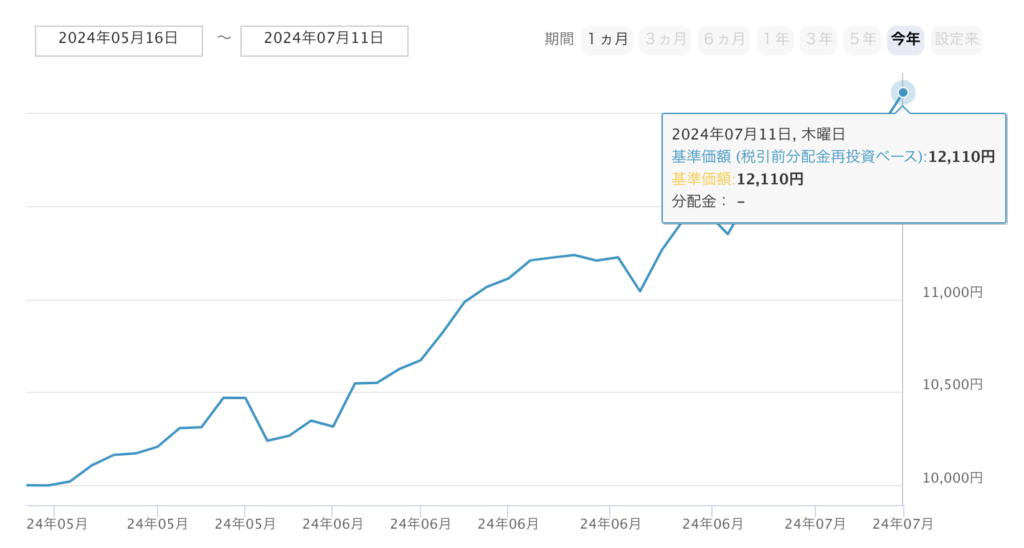 「Tracers S&P500トップ10インデックス(米国株式)」は2024年5月16日に設定され運用を開始されておりますが、この2ヶ月弱だけで既に21.1%のプラスリターンとなっております。