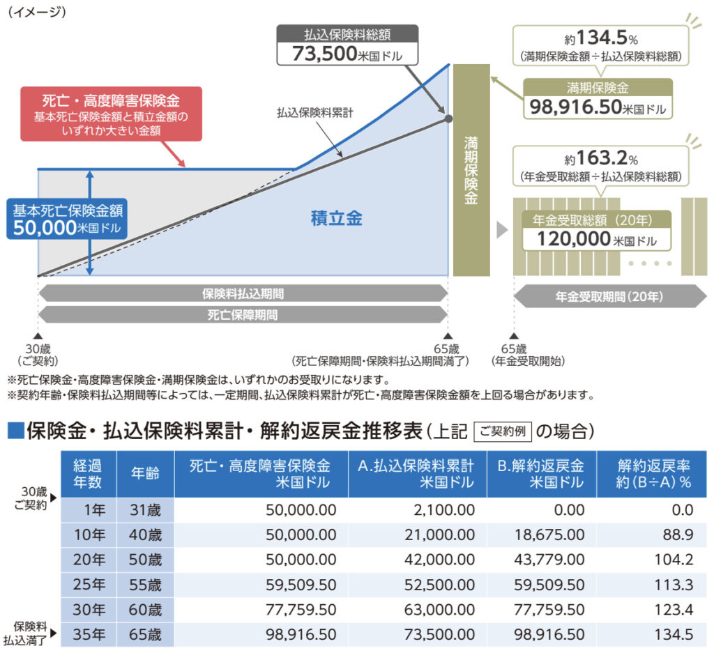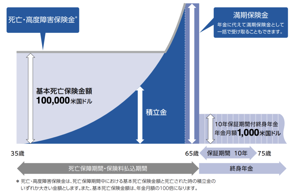 死亡保障額が抑えられている米ドル建の養老保険です。