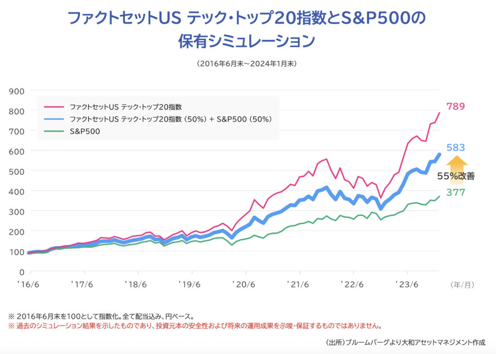 また、ファクトセットUS テック・トップ20指数とS&P500とを半分ずつ保有していた場合、S&P500だけを保有していた場合と比較してパフォーマンスは55%改善したとのことです。