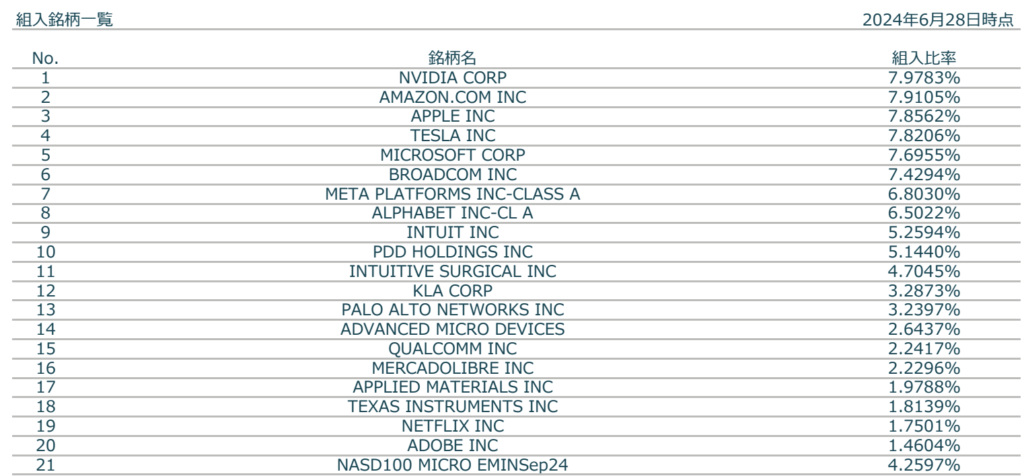 - NASDAQに上場するテクノロジー関連銘柄のうち大型の20銘柄に投資