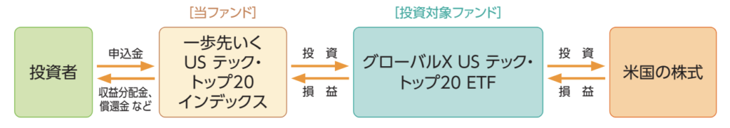・投資成果をFactSet US Tech Top 20指数(配当込み、円ベース)の動きに連動させることをめざして、 Global X Japanが運用する グローバルX US テック・トップ20 ETFに投資する。