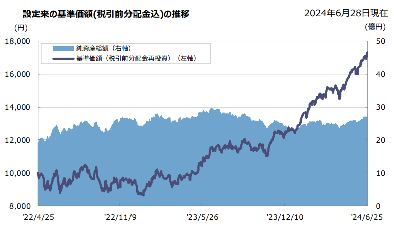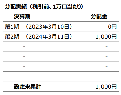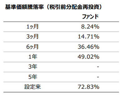 直近1年で+49.02%、設定来で+72.83%の騰落率になります。2年強の運用期間ですが、上記の通り今年は分配金があったようです。