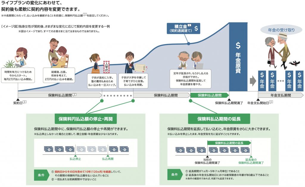 契約から10年以降であれば払込の停止、再開をすることができます。また年金支払開始日に被保険者の年齢が80歳以下であれば、1ヶ月〜5年の範囲内で何度でも延長できます。ただ、10年って結構先の話なので柔軟性があるとは言い難いですね。