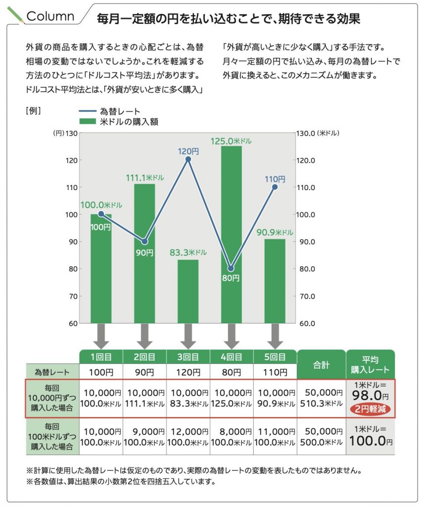 運用は外貨(米ドルまたは豪ドル)ですが、保険料の支払いは円で固定されます。メリットは、支払額が円で固定なので予算が立てやすく、ドルコスト平均法を使うことができます。