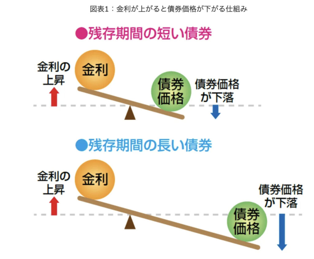 残存期間が長い債券の方がシーソーの長さが長いですし、金利の上昇に対して債券価格が下落する幅も大きいですよね。