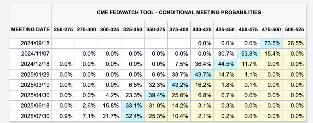 以下は、FOMCが政策金利を変更する確率について、市場が予測しているツールですが、9月18日のFOMC以降も、利下げは続くと考えられております。