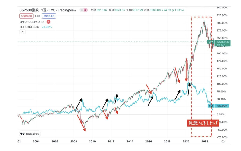 S&P500指数が下落したタイミングでTLTは上昇していることが多く、分散効果が効いていることがわかります。