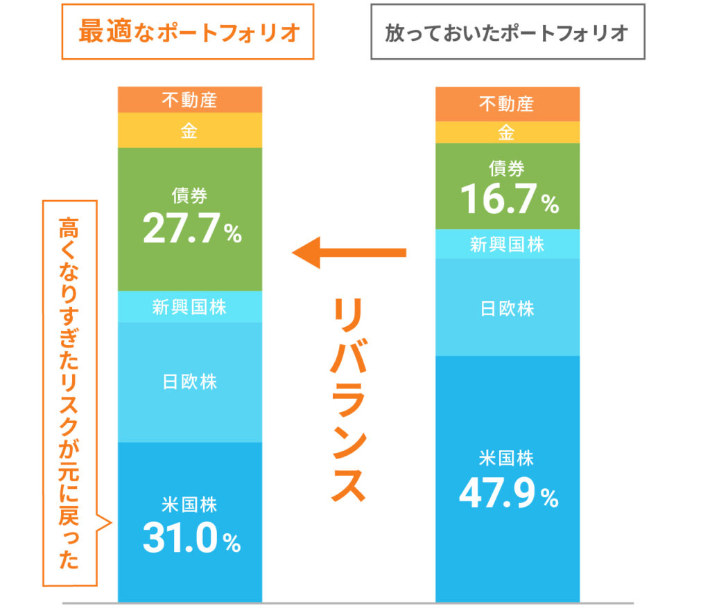 リバランスとは、ポートフォリオの構成比率を定期的に見直し、目標とする資産配分に戻す作業です。これにより、リスクを適切に管理し、資産の偏りを防ぐことができます。