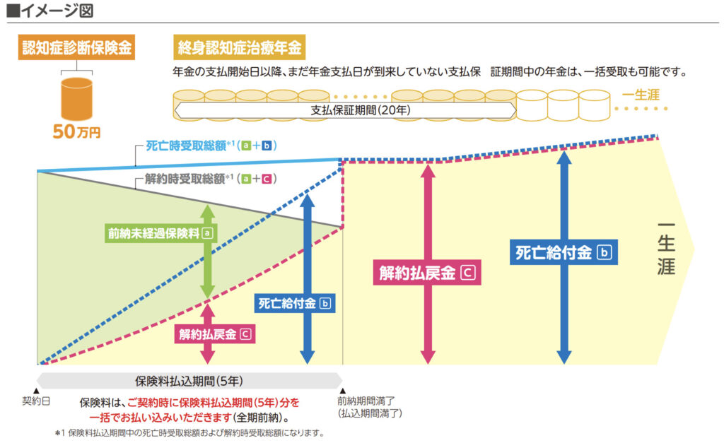 一括払(5年の全期前納)の認知症年金保険です。所定の認知症に該当すると、認知症診断保険金と終身認知症治療年金を受け取れます。生きている限り毎年認知症年金が受け取れます。支払保証期間は20年で、支払保証期間中に死亡したときは、残りの期間分の年金が死亡保険金として支払われます。